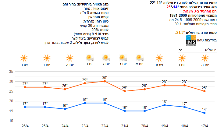 טמפ' ירושלים 14-26 ---- מודיעין עילית 12-27 -- תל אביב 15-21